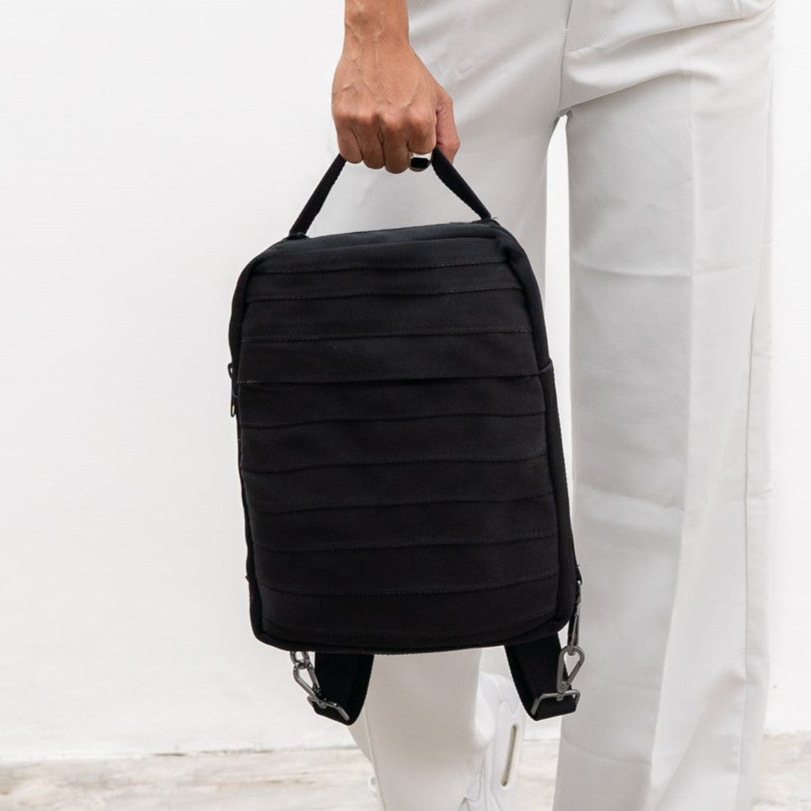 For a while, we have had requests for new black bags and for a smaller backpack and this came together just right. I love how sleek the design is - it’s very modular and gives it such an elevated look and feel. You would never know that this is actually an upcycled piece.
